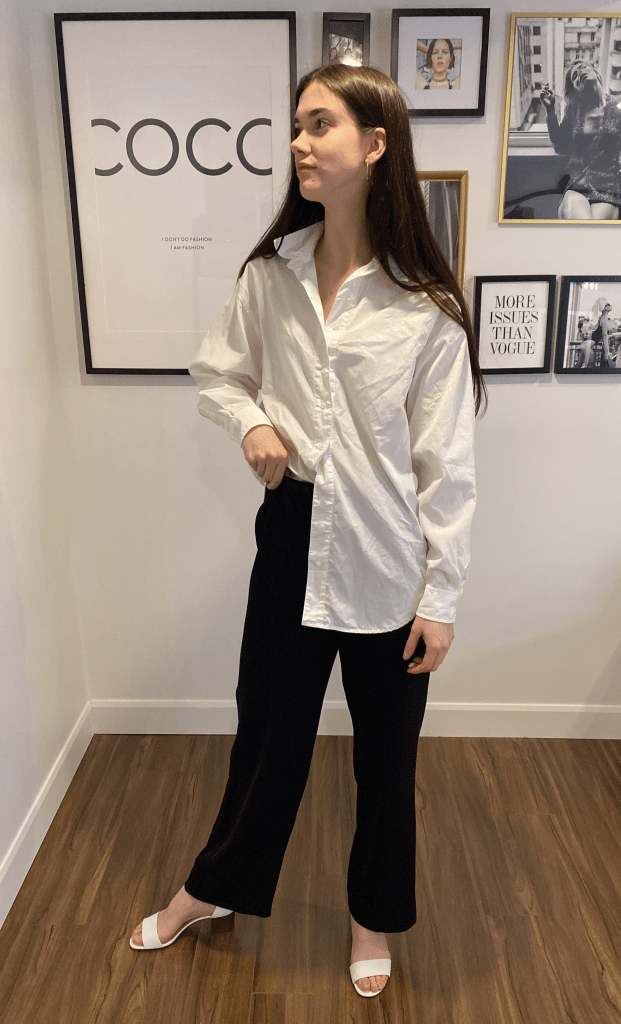 Surdimensionnée, ajustée, en popeline ou en satin la chemise peut se porter comme vêtement principal d’un outfit ou à titre de par-dessus. En plus, il y a tellement de façon de porter une chemise. Je vous dirais que mes façons favorites du moment sont nouée à l’avant, rentrée seulement d’un côté dans le pantalon (comme sur la photo) ou seulement avec deux boutons attachés.