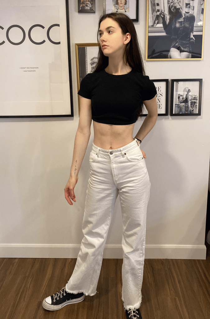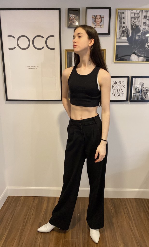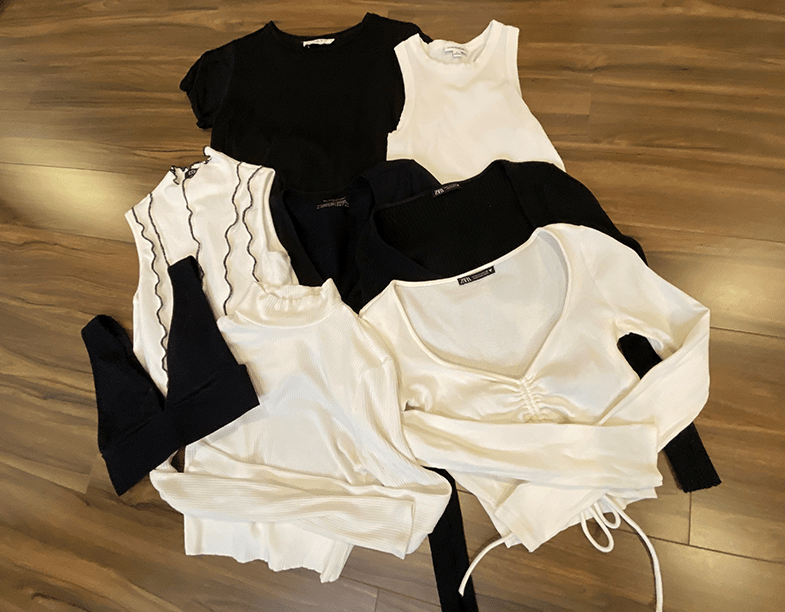 Quand je dis tout, littéralement tout. Tu ne peux pas te tromper avec du blanc ou du noir. Des camisoles, des t-shirts, des crops top, des chandails à manches longues ou des basics avec une twist comme j’aime bien les appeler. Avec un top plus simple, il est facile ensuite d’aller avec un bas ou des accessoires plus éclatés pour que ton outfit soit bien équilibré.